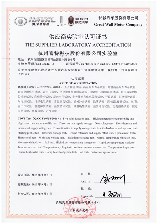 富特科技實(shí)驗(yàn)室獲長城汽車第二方實(shí)驗(yàn)室能力認(rèn)可
