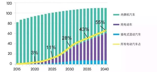 “到2040年,預(yù)計將售出約6000萬輛電動車,相當(dāng)于全球輕型汽車市場的55%。”
