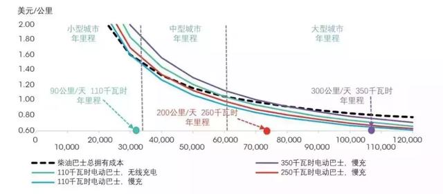 隨著每年行駛里程數(shù)的增加,電動巴士的總擁有成本顯著降低,面對柴油巴士的優(yōu)勢逐漸擴大。例如,一輛裝配有110千瓦時電池的電動巴士加上最昂貴的無線充電裝置,每年行駛約60000公里時(3.7萬英里),其總擁有成本與柴油巴士持平。