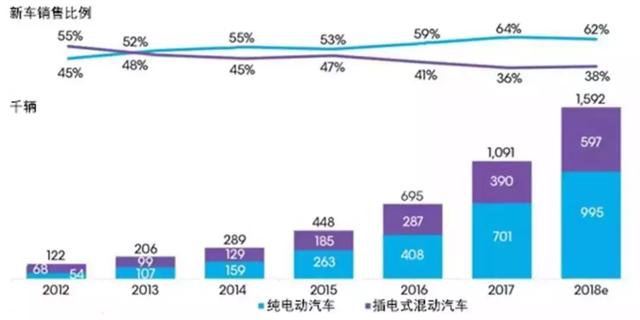 圖1為2012年至2018年全球不同類型乘用電動汽車銷量及預(yù)測